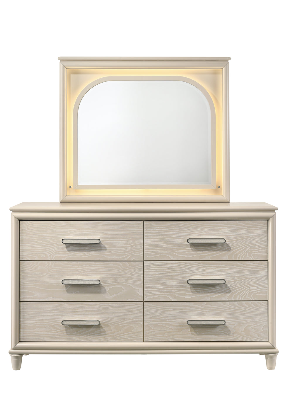 Elevate your sleep space with the B6650 Aviana bedroom set, featuring a luxurious Cappuccino Foam upholstered headboard paired with an illuminated mirror and LED lighting for ambiance and functionality. The integrated storage bed maximizes space while eliminating boxspring requirements, while the coordinating nightstand offers dual charging ports—USB and Type C—to keep your devices powered through the night. Refined wooden bun-feet and smooth ball bearing glides deliver both elegance and seamless mobility. Textured grain-embossed drawer fronts add sophisticated visual depth. Complete bedroom comfort designed for the modern lifestyle.