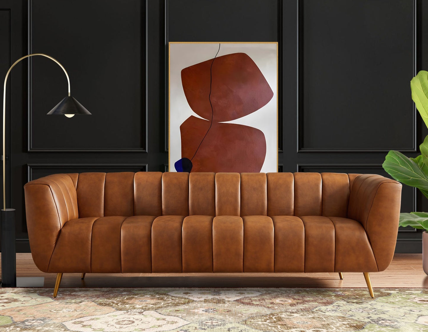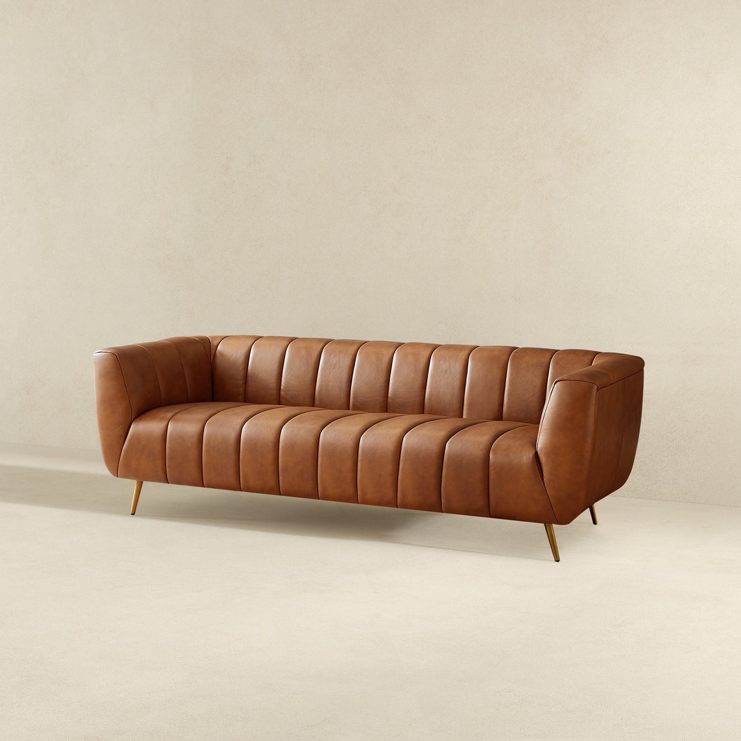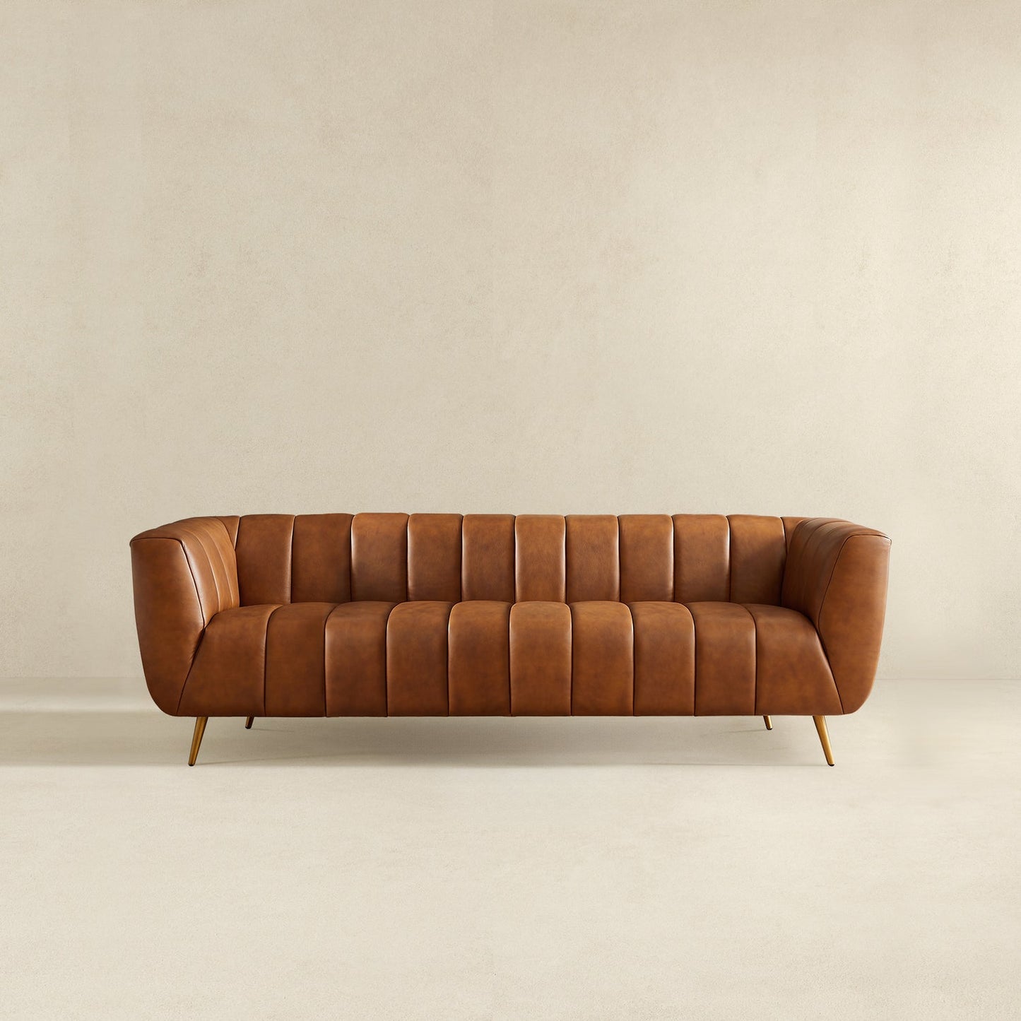 Ava Genuine Italian Tan Leather Channel Tufted Sofa