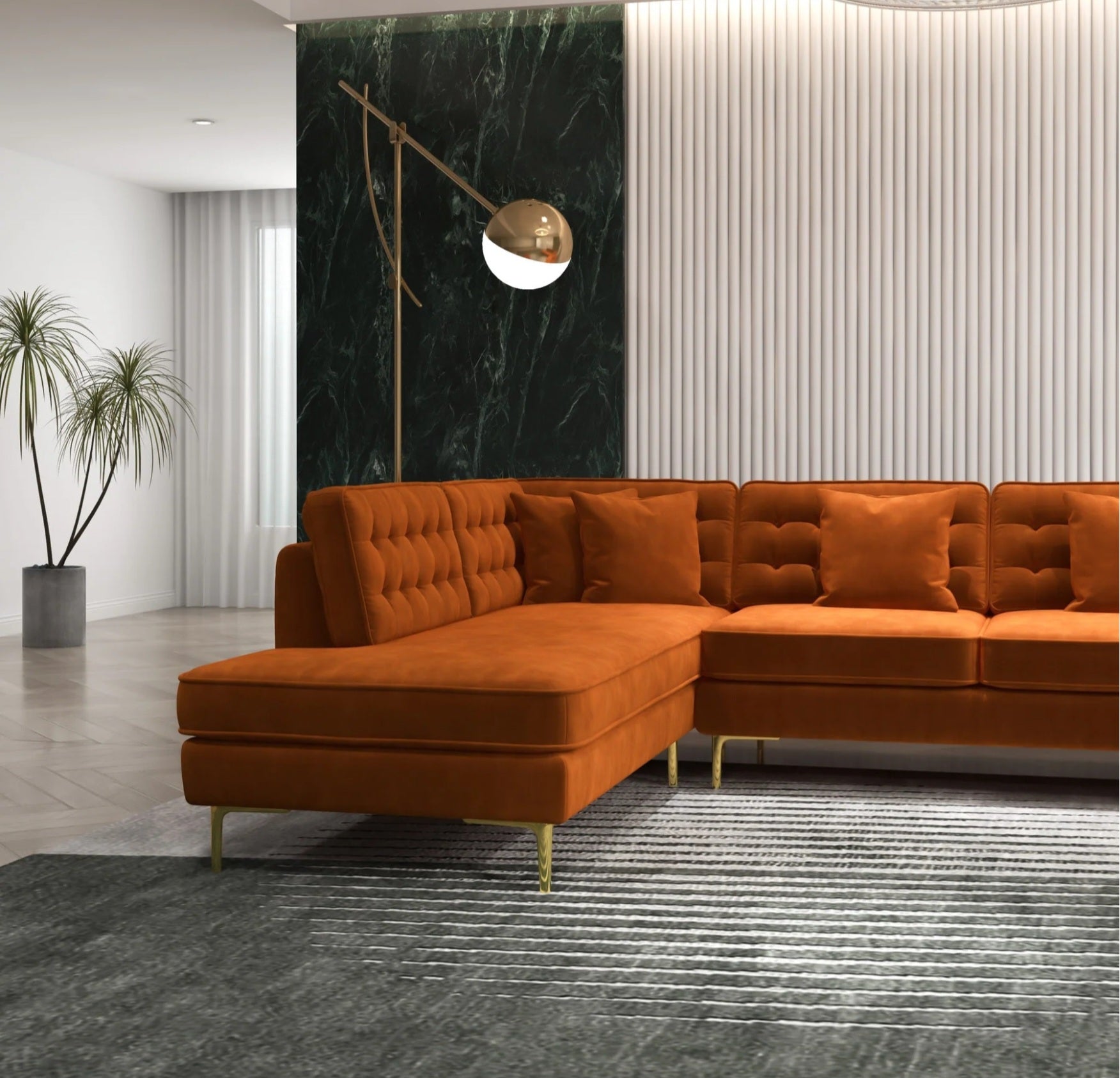 Brooke is mid-century modern-inspired corner sectional couch that will provide a fresh and pleasing look to your space and will be the center of attention thanks to its clean, sleek design. This modern wide bumper couch made of high-quality dark green upholstered and elegant gold metal legs creates an inviting space as game room furniture for entertainment activities. This sectional sofa creates spaces in big and small homes, apartment living, game room urban loft condos. This comfortable sectional sofa made consists of a chaise and a seater which can be used separately in living rooms or a sleeper sofa. Removable legs allow for simple delivery for tight spaces. Easy clean, assembly, everyday use comfortable and affordable quality velvet sofas.