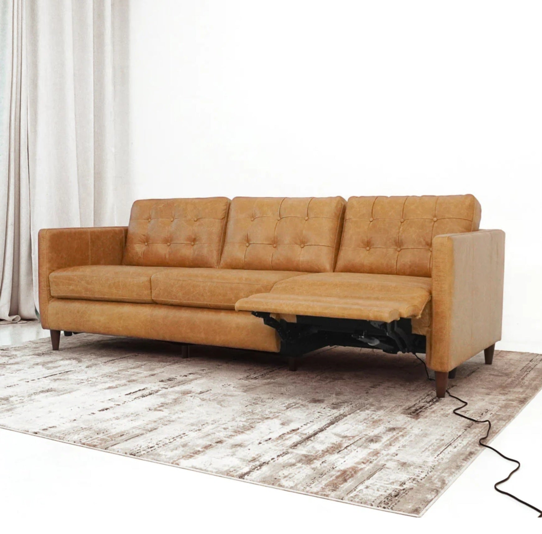 This quality recliner couch has a power reclining function for one seat, which works with a common electricity plug. The loveseat part is fixed. The contemporary brown top leather sofa is upholstered on a kiln-dried block joint solid wood frame with midcentury modern tapered legs in a walnut color. The tufted seat and back are filled with foam to provide plenty of support, making it suitable for use as game room furniture. Additionally, one of the sofa chairs is lifted by a power reclining feature, making it a great option for a relaxing reading chair.