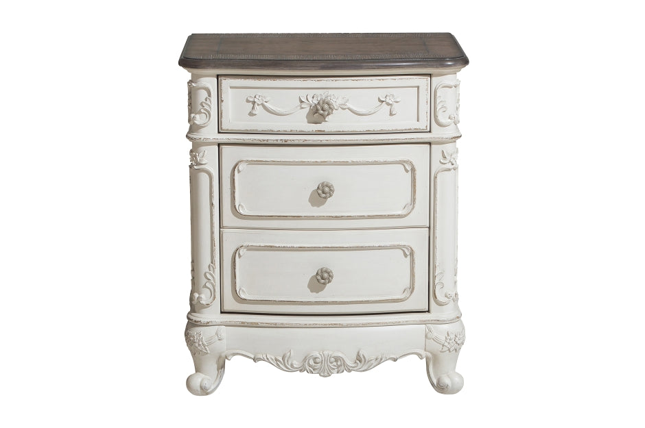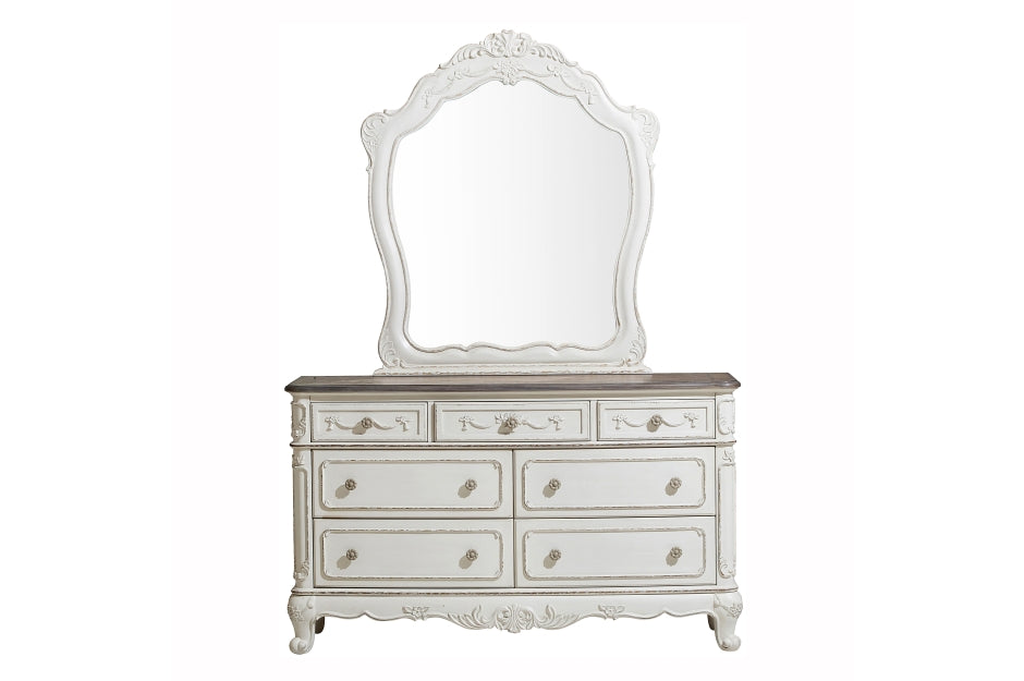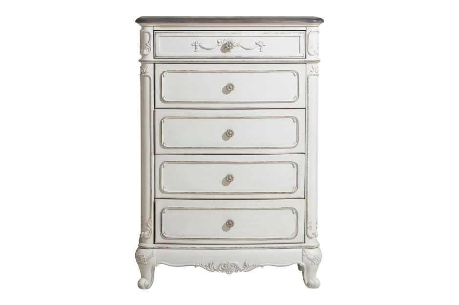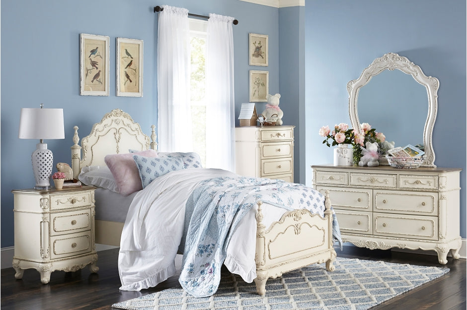 The Cinderella Collection is your little child's dream. The Victorian styling incorporates floral motif hardware and traditional carving details that will create the feeling of a room worthy of a fairy tale. Antique white with grey rub-through finish when paired with the multitude of case pieces and panel bed allows versatility of placement and decor within your available space.