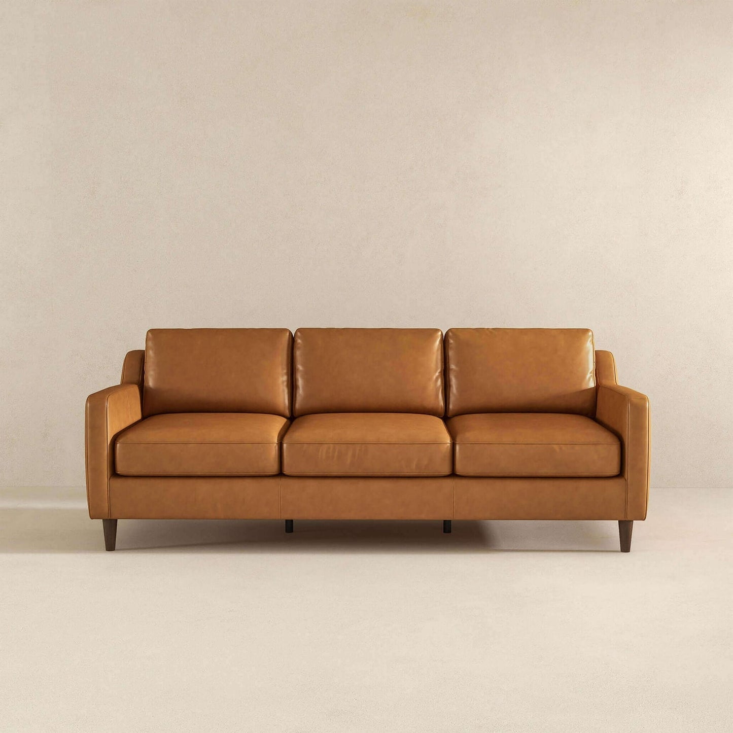 Anchor your space in mid-century modern style with the Cooper Tan Leather sofa. Combining durable, top-quality craftmanship and high-density foam this sofa will provide you with great comfort and undoubtedly become the centerpiece of your living room, den, urban loft, condo or home office. It is made of Genuine Leather and can be cleaned with a non-abrasive cleaning solution followed by a quick microfiber cloth. Removable legs allow for simple delivery for tight spaces. Available in a variety of timeless colors, you're sure to find something that matches your decor