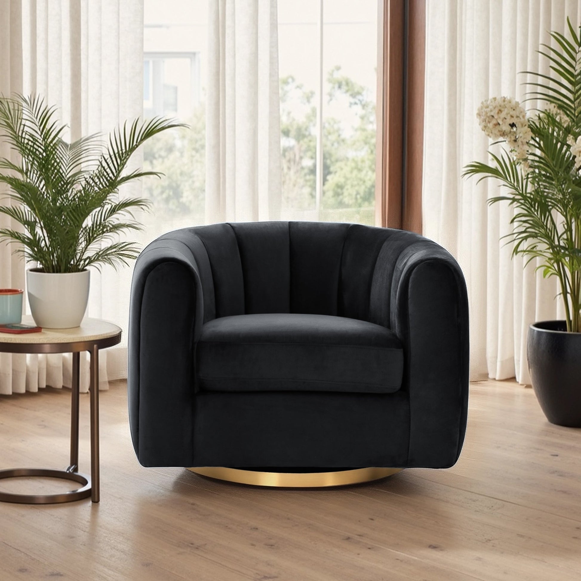 Introducing the epitome of relaxation and style, the comfy swivel chair embodies the essence of modern comfort and sophistication. Crafted to elevate any living space, whether as a focal point in the living room or a cozy addition to your bedroom corner, this chair seamlessly blends versatility with timeless design. Crafted from manufactured plywood for durability. The gold plated metal swivel base offers durability and long live for those who seeks high-quality.