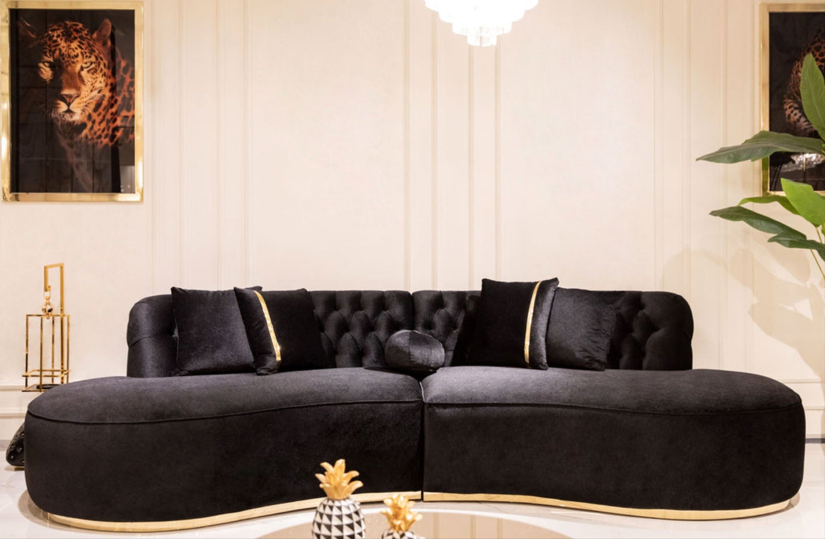 Ella 2-Piece Curved Sectional is crafted with meticulous attention to detail, featuring premium boucle upholstery and handcrafted deep button tufting. The bottom of the chaise lounge features a striking gold detail, adding a touch of opulence and glamour. The Ella sectional features a stunning curved design that adds a touch of elegance and visual excellence to your space.