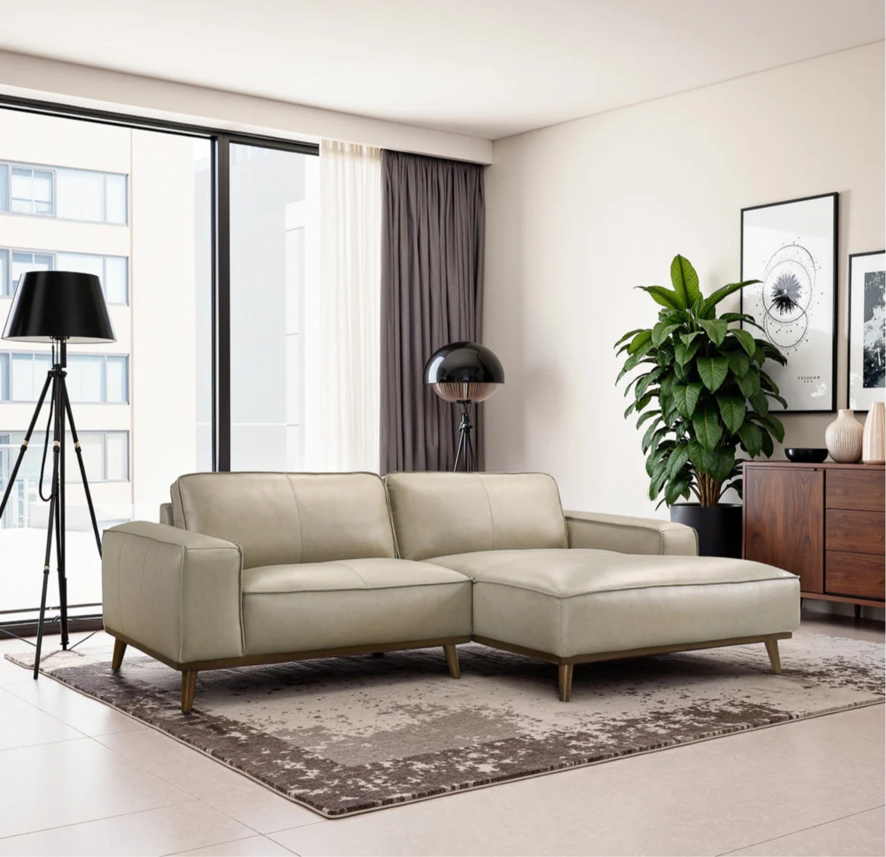 Transform your living space with our stunning sectional sofa and chaise, crafted to bring both style and comfort into your home. Its mid-century modern design offers a timeless appeal that effortlessly blends with any decor, making your living room feel warm and inviting. The top grain genuine leather upholstery not only looks luxurious but also feels soft and breathable—perfect for relaxing after a long day or hosting friends.