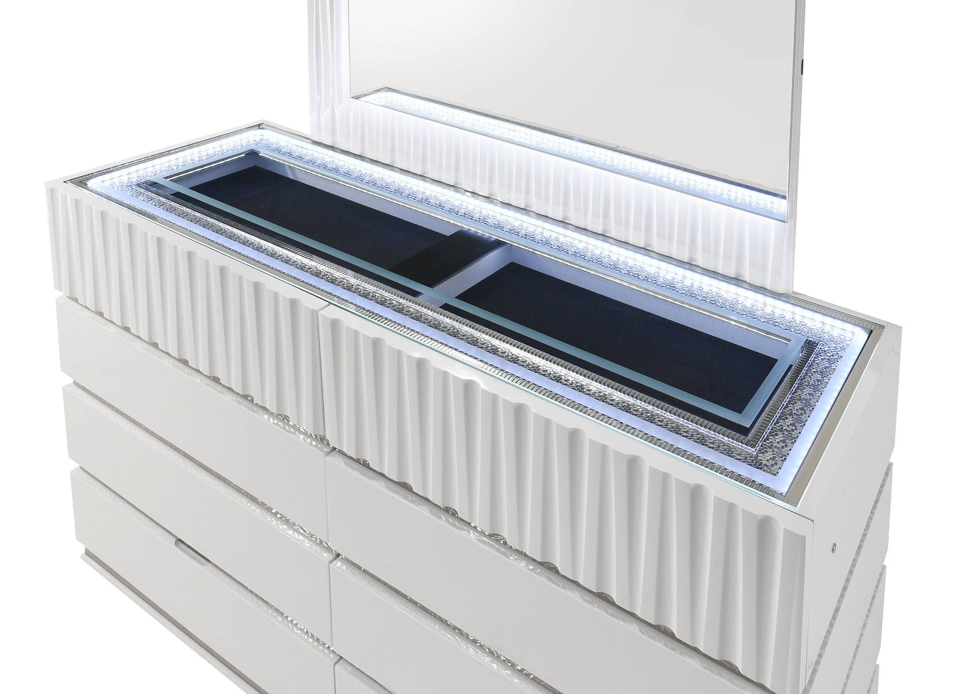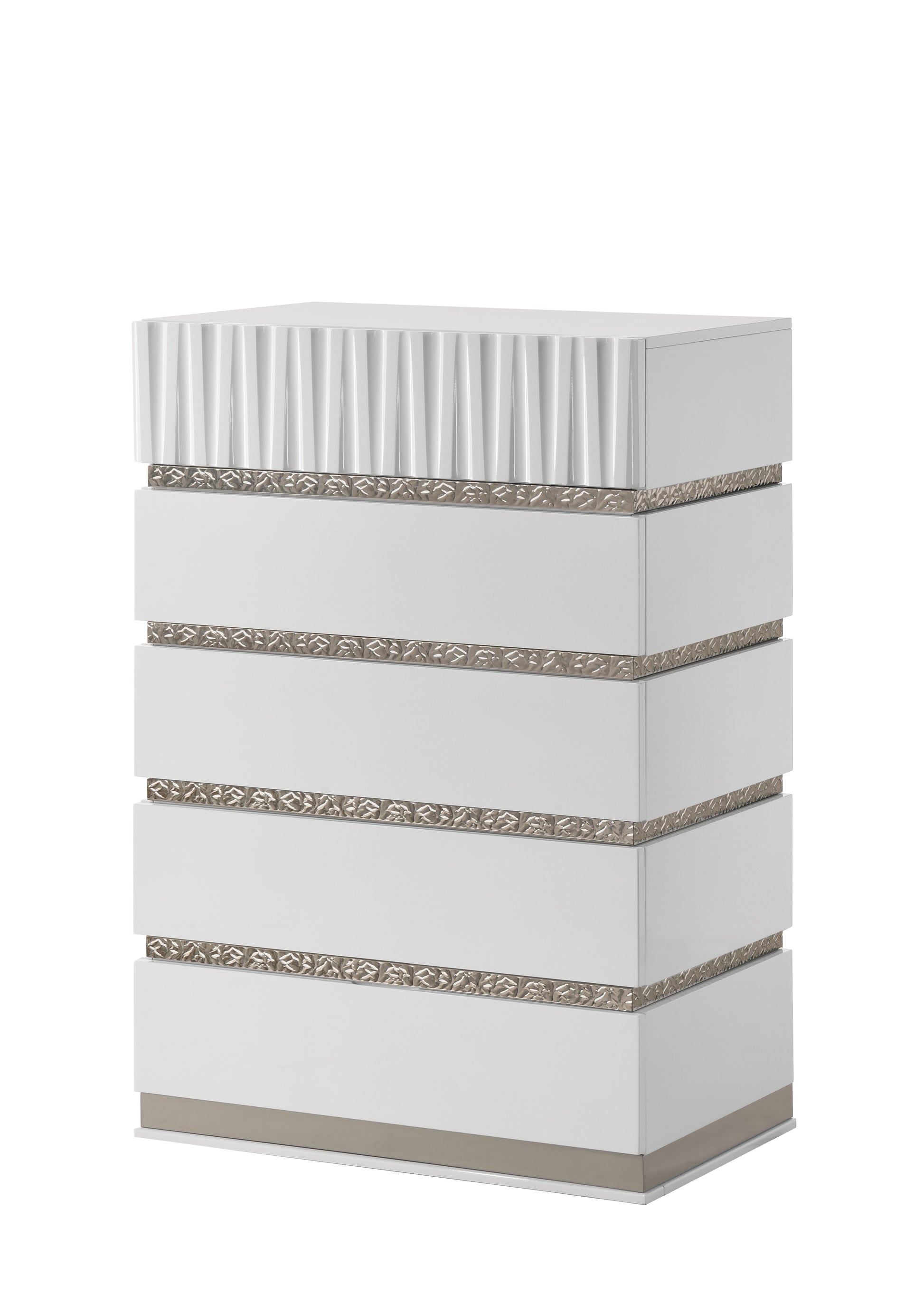 - Vertical Fluted Texturing: A distinctive feature of this model is the deep vertical fluting found on the headboard, footboard, and the top drawers of all case goods. This texture adds architectural depth to the high-gloss finish.