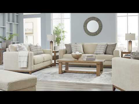 Serene style with a modern sensibility. Delight in the cozy, versatile embrace of this living room set. It takes an on-trend approach to irresistible texture and natural beauty, showcasing soft neutral upholstery accented with a transitional wood trim. As refined as it is laid back, the set also keeps comfort a priority with plush, thick seat cushions.