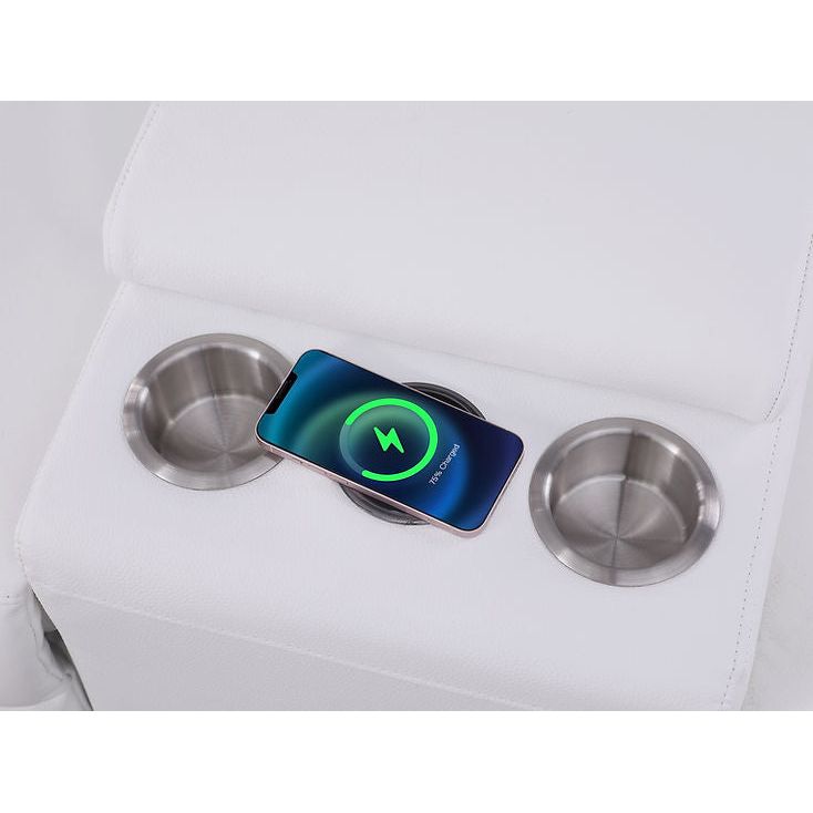 Introducing the exquisite Picasso Sectional in a refreshing White, a testament to modern Contemporary Style. Crafted with meticulous attention to detail, this sectional features a harmonious blend of luxury and functionality. The Leather Match upholstery offers a perfect balance between opulence and practicality. Equipped with three Power Recliners and two Power Headrests, this sectional ensures personalized comfort at your fingertips. The thoughtfully designed Console comes with convenient Cupholders, allowing you to relish your favorite beverages while lounging. To keep you connected, a built-in Wireless Charger ensures your devices stay powered without interruption. Elevate your living space with the Picasso Sectional, where sophistication and innovation converge seamlessly.