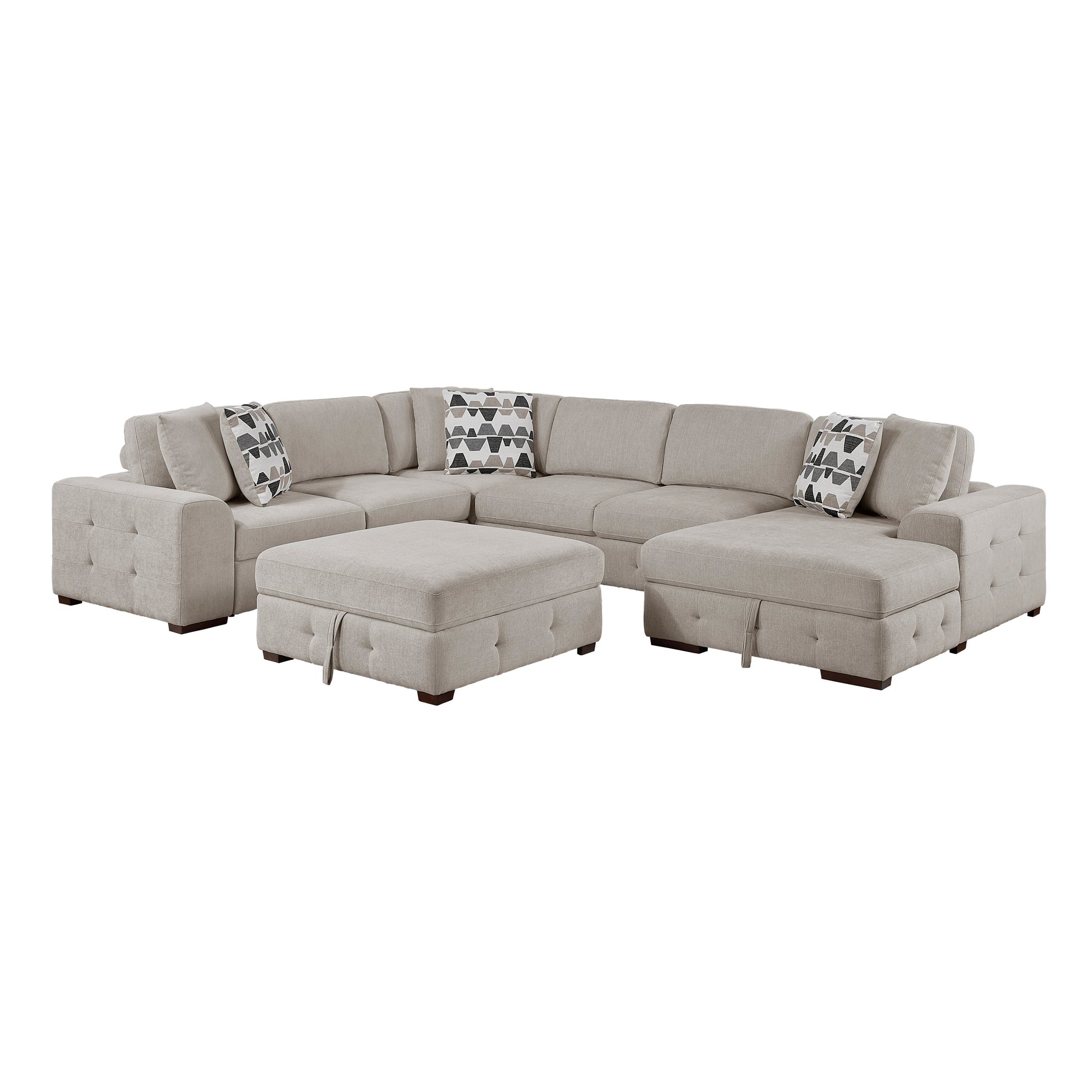 Create the ultimate entertainment and relaxation space with this five-piece chenille U-shaped sleeper sectional, featuring a left-side two-seater with a convenient pull-out bed, an armless two-seater, a corner seater, a right-side chaise with hidden storage, and a matching storage ottoman. The high-density memory foam padding over pocket coils and soft chenille fabric upholstery provide exceptional comfort and support for large gatherings or relaxing evenings. Reversible back and attached seat cushions extend the life of your sectional, while removable back cushion covers simplify cleaning. Tufted details add a touch of classic elegance, and the solid wood legs in an espresso finish provide a sophisticated foundation. Perfect for hosting guests, movie nights, or maximizing seating and storage, this sectional offers both style and functionality.